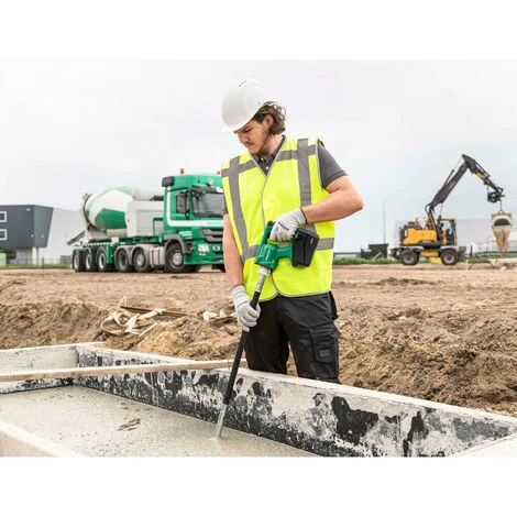 Der Akku-Betonverdichter hat einen Brushless Motor, welcher weitestgehend wartungsfrei ist. Hohe Schwingungsfrequenz, bis zu 40% schneller als Standardmodelle. Zwei Vibrationsstufen (Normal Modus / Power Modus). Eine Schutz-Abdeckung verhindert das Eindringen von Beton in den Akku bzw. das Motorgehäuse. Lüftungsschlitze am unteren Gehäuse verhindern einen Anstieg der Motortemperatur. Bis zu 60 min. Laufzeit mit einem BSL36B18.